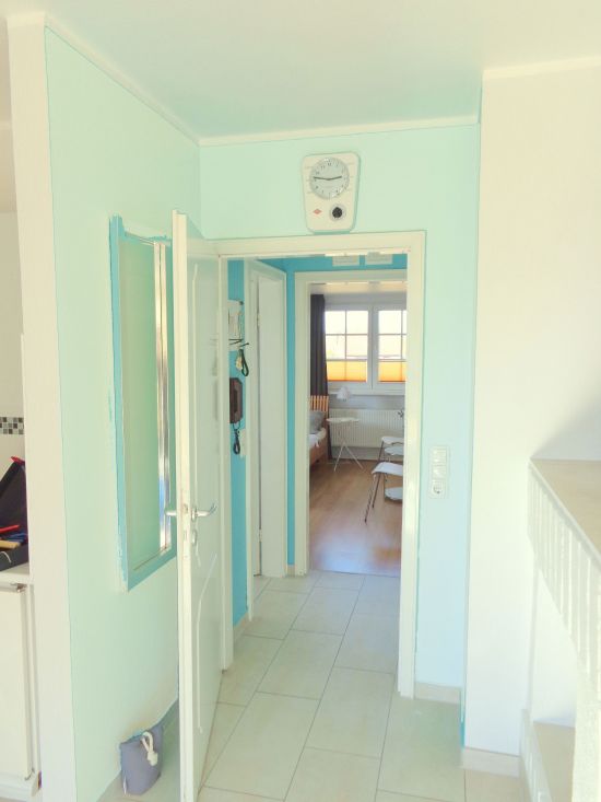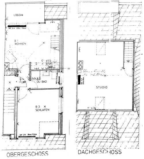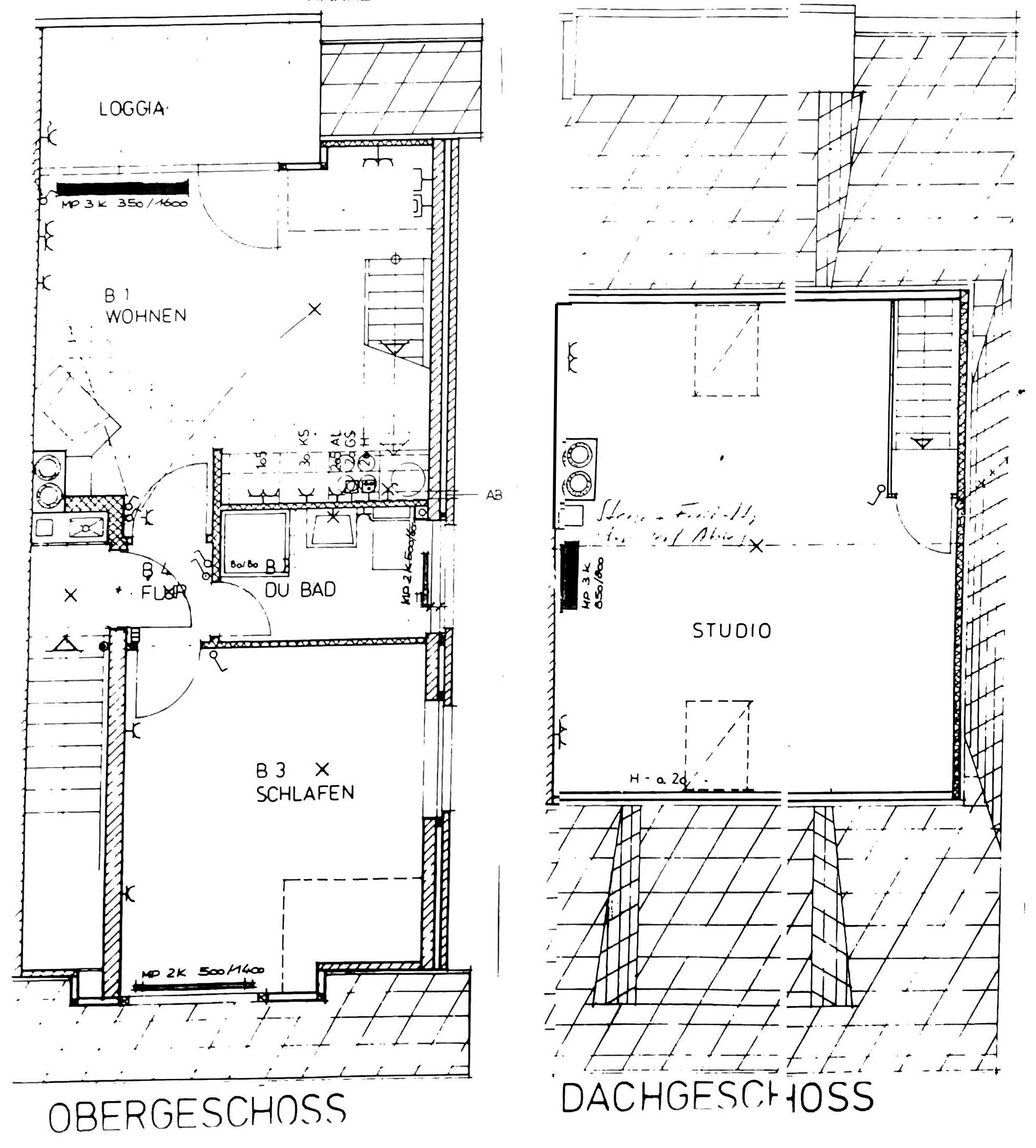 - Obergeschoss: Wohn-/Essbereich mit Küchenzeile und Balkon, Bad, Schlafzimmer mit Doppelbett